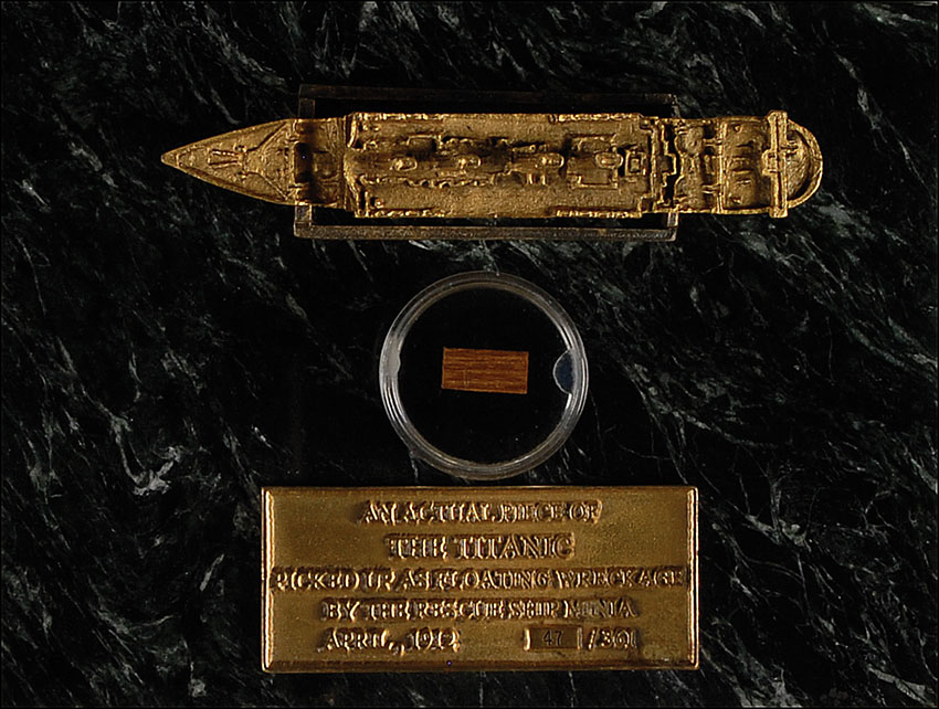 Limited edition display of an actual piece of wood, .5 x .25, of a mahogany door panel from the Titanic. The panel was picked up as floating wreckage by the rescue ship Minia in April of 1912. Fragment is housed in a clear specimen box which is mounted to a 6 x 4.5 sea-green serpentine stone base along with a detailed four-inch long solid brass model of the ship, and a cast brass information plaque which reads, “An actual piece of The Titanic picked up as floating wreckage by the rescue ship Minia, April, 1912 #47/361.” In fine condition. Accompanied by a certificate of authenticity from Eric Caren, and a 28-page forensic report, dated April 1998, documenting the artifact. RRAuction COA.