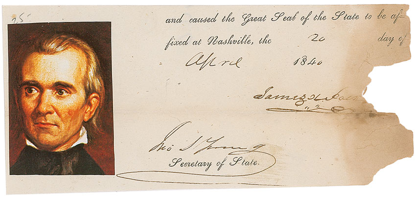 Ink signature as Governor of Tennessee, “James K. Polk,” on an off-white 6.5 x 3 slip clipped from the bottom of a larger document dated April 20, 1840, featuring a clipped image of Polk affixed to the left edge. In good condition, with a central horizontal fold, and heavy toning and paper loss affecting appearance and the end portion of the signature. Pre-certified John Reznikoff/PSA/DNA and RR Auction COA.