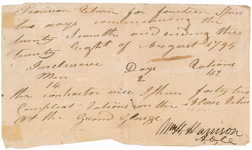 Manuscript DS, signed “Wm. H. Harrison, A. D. C.,” one page, 8 x 4.5. “Provision return for fourteen Spies two days commencing the twenty seventh and ending the twenty eighth of August 1794 Inclusive—Men: 14; Days: 2; Rations: 42.” The document goes on to state that the contractor will issue 42 rations. In very good condition, with central horizontal and vertical fold, light toning, a rough bottom edge, and light show-through from adhesive remnants to the left corners. Pre-certified John Reznikoff/PSA/DNA and RR Auction COA.