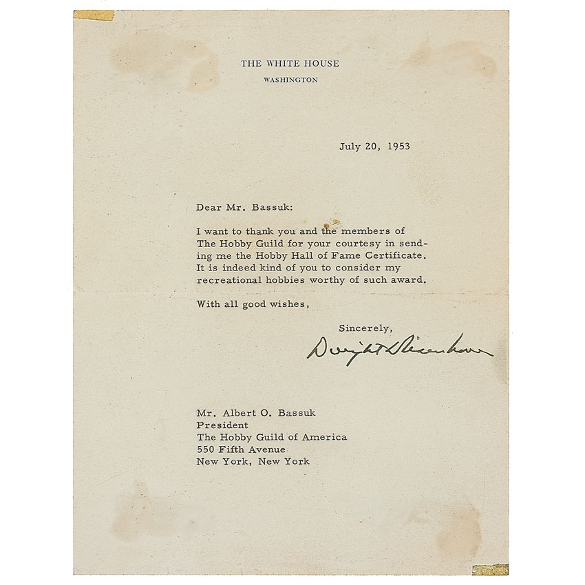 TLS as president, one page, 7 x 9, White House letterhead, July 20, 1953. Eisenhower writes to Albert Bassuk, President of the Hobby Guild of America, in full: “I want to thank you and the members of The Hobby Guild for your courtesy in sending me The Hobby Hall of Fame Certificate. It is indeed kind of you to consider my recreational hobbies worthy of such award.” In very good condition, with a central horizontal crease, adhesive remnants at the top left and bottom right corner, and mild show-through from mounting remnants on the reverse. Pre-certified John Reznikoff/PSA/DNA and RR Auction COA.