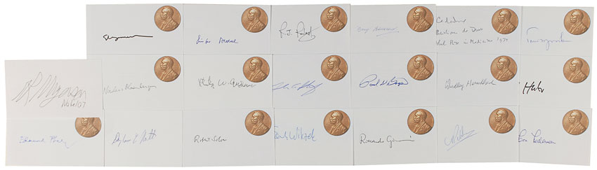 Ink and felt tip signatures of 20 Nobel Prize winners on individual white 5 x 3 cards bearing a printed image of the Nobel medallion. Signers are: Toni Morrison (1993 Literature), Elizabeth Blackburn (2009 Medicine), Christian de Duve (1974 Medicine), Baruj Benacerraf (1980 Medicine), Richard J. Roberts (1993 Medicine), Günter Blobel (1999 Medicine), Robert Huber (1988 Chemistry), Dudley R. Herschbach (1986 Chemistry), Paul D. Boyer (1997 Chemistry), Thomas A. Steitz (2009 Chemistry), Philip Warren Anderson (1977 Physics), Nicolaas Bloembergen (1981 Physics), Leon Lederman (1988 Physics), Martinus J. G. Veltman (1999 Physics), Riccardo Giacconi (2002 Physics), Frank Wilczek (2004 Physics), Robert Solow (1987 Economics), Douglass North (1993 Economics), Edmund Phelps (2006 Economics), and Roger Myerson (2007 Economics). In very fine condition. RRAuction COA.