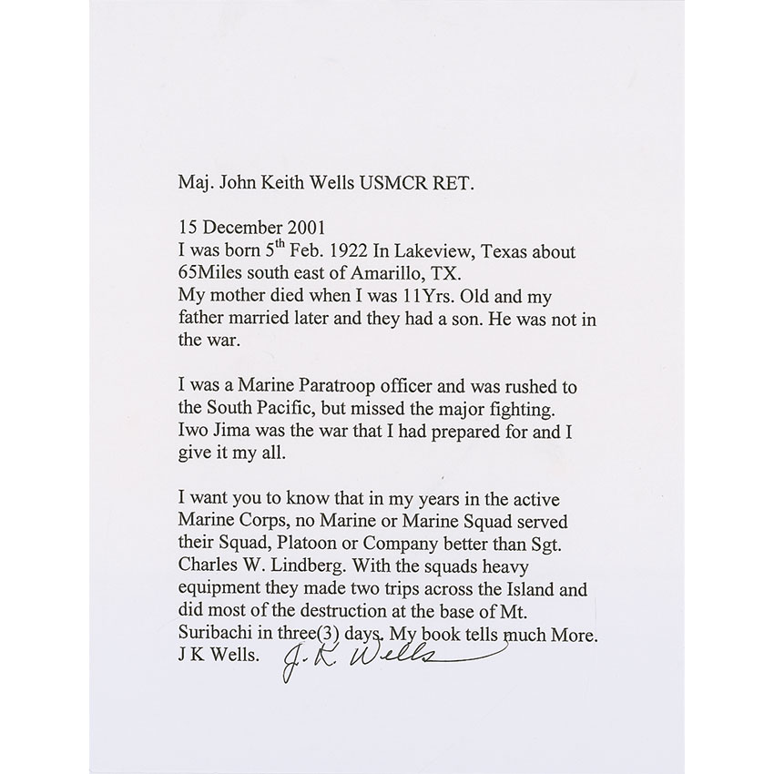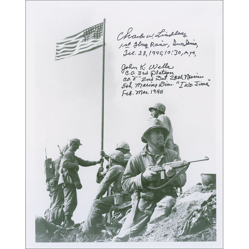 Two items: satin-finish 8 x 10 photo of the first flag raising on Mount Suribachi, signed in black felt tip, “Charles W. Lindberg, 1st Flag Raiser, Iwo Jima, Feb. 23, 1945, 10:30, A. M.” and “John K. Wells, C. O. 3rd Platoon, CO ‘E’ 2nd Bat. 28th Marines, 5th Marine Div. ‘Iwo Jima’ Feb. Mar. 1945” ; and a one-page typed testimonial, signed by Wells, dated December 15, 2001, detailing his and Lindberg’s involvement at Iwo Jima. In fine condition. RRAuction COA.
