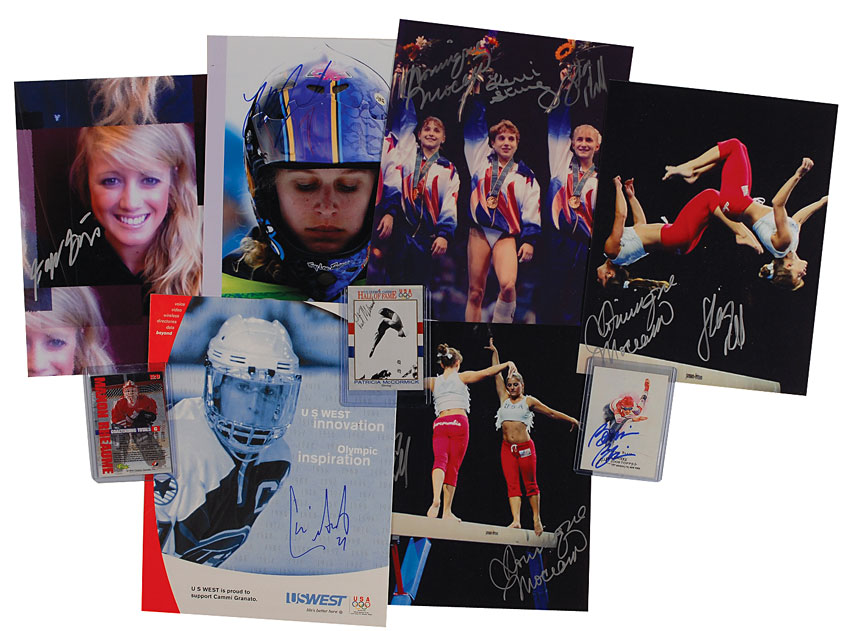 Nine items: five color glossy photos, 8 x 10, each featuring Olympic athletes, and each signed in ink or felt tip by the respective athlete(s) pictured. Signers are: Shannon Miller (3), Dominique Moceanu (3), Kerri Strug, Lindsey Jacobellis, and Faye Gulini; three trading cards, each measuring approximately 2.5 x 3.5, each signed in ink, and each featuring an Olympic athlete (Bonnie Blair, Manon Rheaume, and Patricia McCormick); and a program for Cammi Granato’s Golden Dreams for Children Foundation, August 29, 1999, 8.5 x 11, commemorating the First Annual Charity Hockey Game, signed on the back in blue felt tip. In fine condition. RRAuction COA.