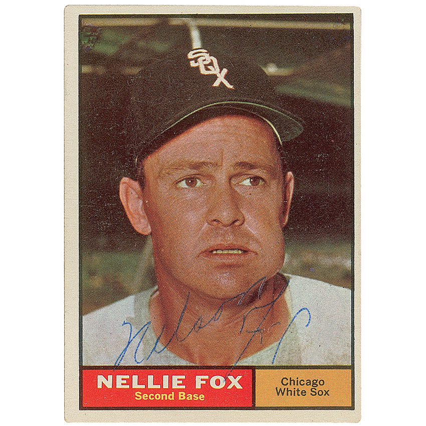 Topps 1961 Nellie Fox baseball trading card, 2.5 x 3.5, signed on the front in blue ballpoint. In fine condition, with a bit of light signature contrast. Pre-certified Steve Grad/PSA/DNA and RR Auction COA.