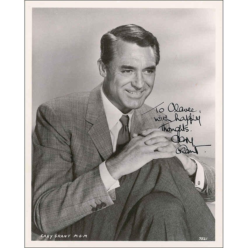 Handsome vintage matte-finish 8 x 10 photo of Grant sitting with his legs crossed, signed and inscribed in fountain pen “To Olavee, with happy thoughts. Cary Grant.” In fine condition, with a few scattered light creases and a couple trivial spots to background. Pre-certified PSA/DNA and RR Auction COA.