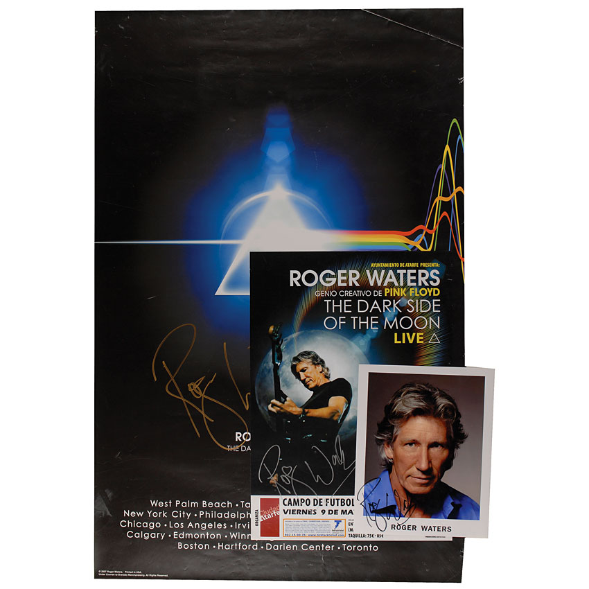 Three items: color 22 x 33 tour poster for his 2007 Dark Side of the Moon tour, signed in gold ink; a color 12 x 17 Dark Side of the Moon tour poster, in Spanish, signed in silver ink; and a color glossy 8 x 10 head-and-shoulders photo, signed in black felt tip. Scattered creases and edge dings to both posters, otherwise fine condition. Pre-certified Roger Epperson/REAL and RR Auction COA.