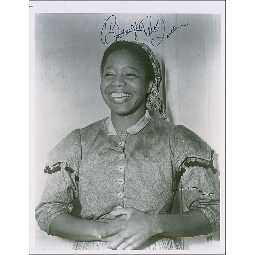 Glossy 8 x 10 photo of McQueen in her garb as Prissy from Gone With the Wind, signed in black felt tip. In fine condition, with adhesive remnants on the reverse. Pre-certified PSA/DNA and RR Auction COA.