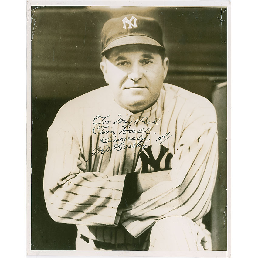 Vintage glossy 8 x 10 photo of McCarthy posing in his Yankee pinstripes, signed and inscribed in fountain pen “to My Pal Tim Hall, Sincerely, Joe McCarthy 1942.” In very good condition, with scattered noticeable creases and surface marks. Pre-certified Steve Grad/PSA/DNA and RR Auction COA.