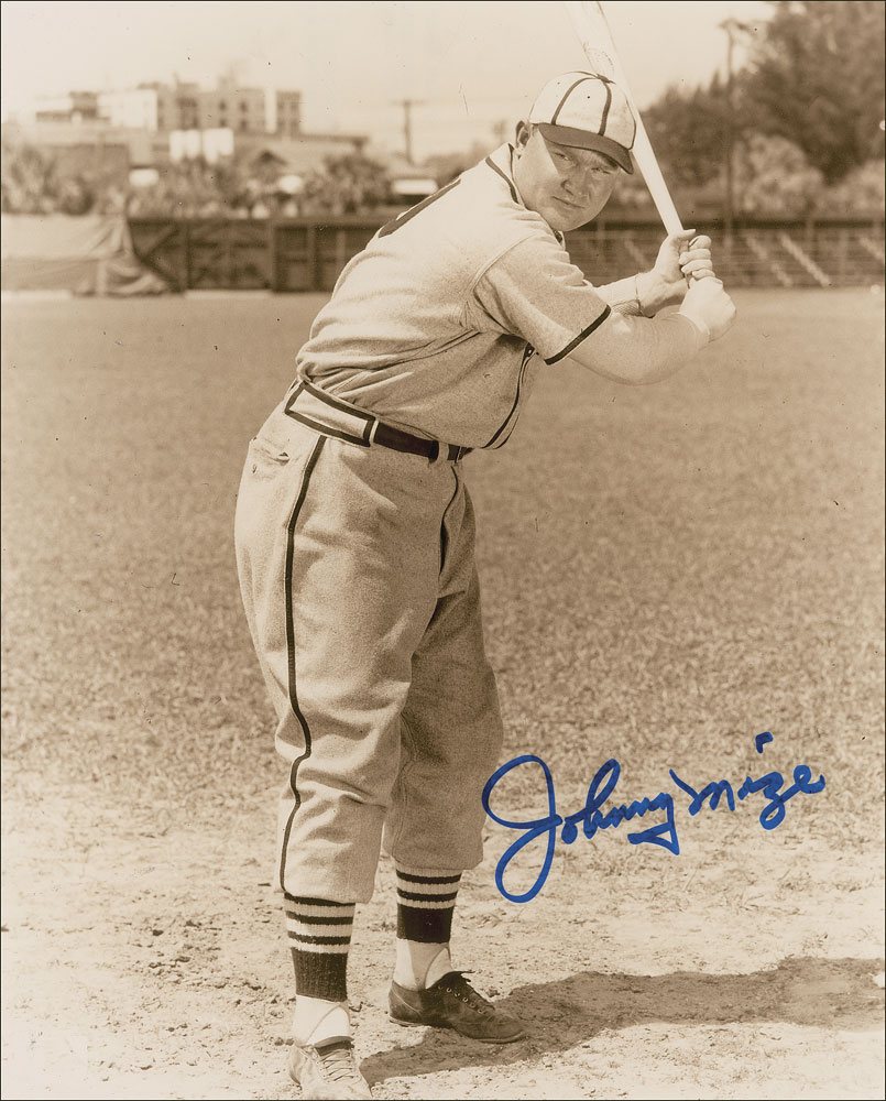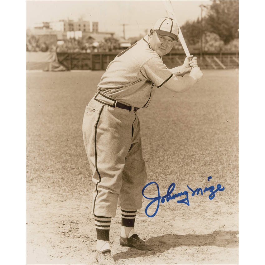 Glossy 8 x 10 photo of Mize in his batting stance, signed in blue felt tip. In fine condition, with some scattered light creases. Pre-certified Steve Grad/PSA/DNA and RR Auction COA.