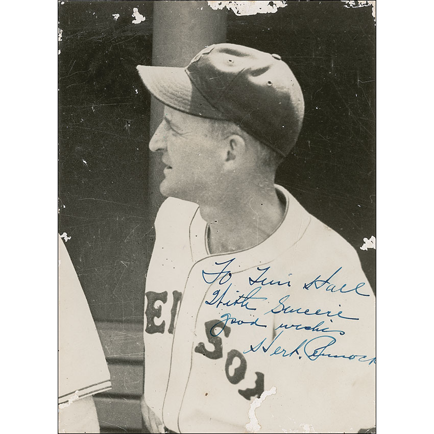 Hall of Fame pitcher who threw 35 shutouts. Rare vintage glossy 5.75 x 8 photo of Pennock from his time as a Red Sox coach, signed and inscribed in fountain pen “To Tim Hall, With sincere good wishes, Herb Pennock.” In good to very good condition, with trimmed edges, with right edge abutting on end of signature, scattered creases, surface marks, and impressions, and scattered surface loss, mainly to edges. Pre-certified Steve Grad/PSA/DNA and RR Auction COA.