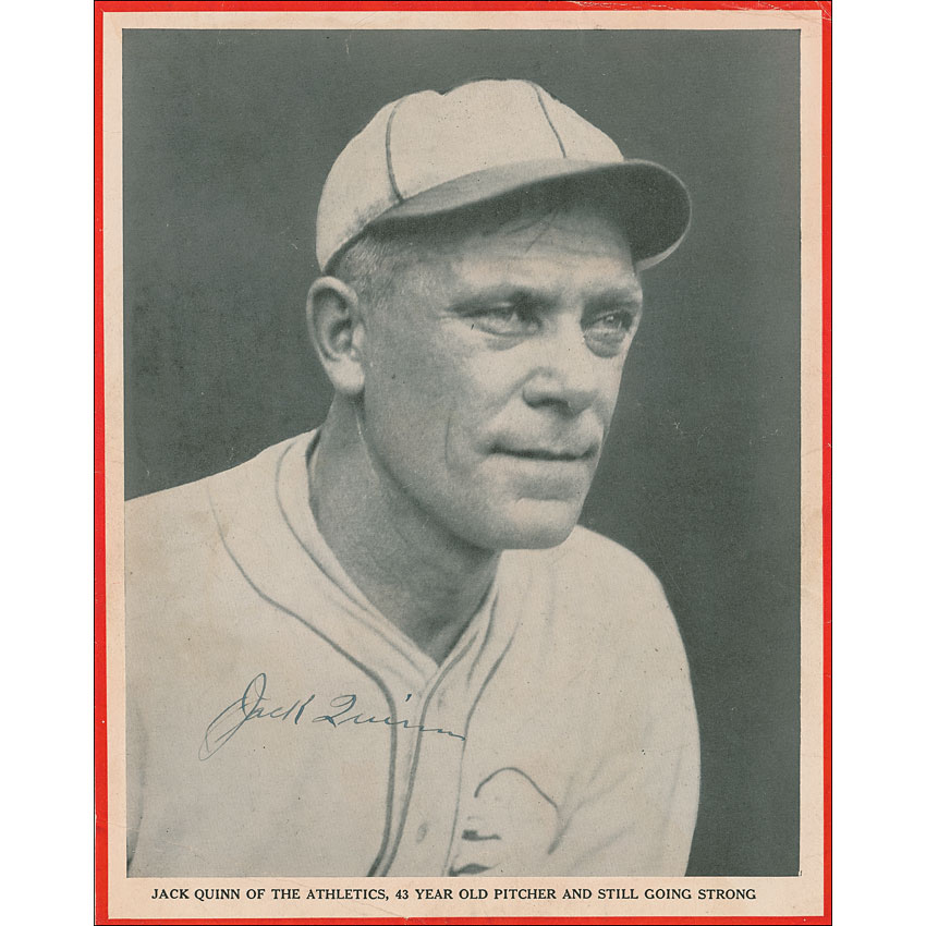 Major League pitcher (1883–1946) who made his final appearance at the age of 50. Vintage 8.25 x 10.25 photo taken from the inside cover of a sample copy of Baseball magazine, signed in fountain pen. Scattered creases and surface marks, as well as some light wrinkling, otherwise fine condition. Pre-certified Steve Grad/PSA/DNA and RR Auction COA.