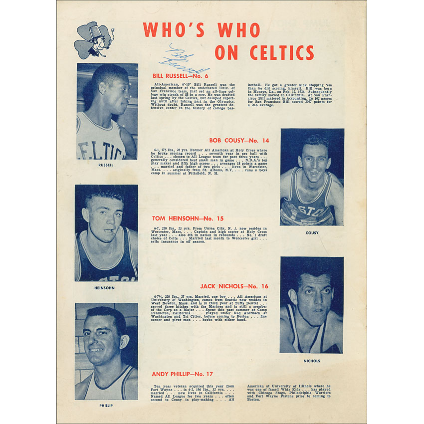 Rare original vintage Boston Garden program from the January 27, 1957, game between the Celtics and the New York Knicks, 8 x 11, signed inside in blue ballpoint above his image and biography by Russell. In very good condition, with missing covers, scattered light toning and soiling, and ink notations to inside and scorecard. Anything signed by Russell in this time period is quite uncommon. Pre-certified Steve Grad/PSA/DNA and RR Auction COA.
