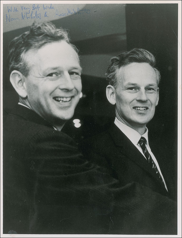 Twin brothers who founded the Guinness Book of World Records. Ross was assassinated by the IRA in 1975. Vintage 6.5 x 8.25 semi-glossy photo of the brothers, signed in blue ballpoint, “With very best wishes, Norm McWhirter &,” and “Ross McWhirter.” In fine condition, with some scattered light spotting to left side of image and some light contrast to end of one signature. RR Auction COA.