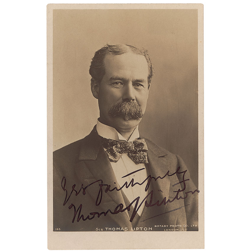 Self-made man, merchant, and yachtsman (1848–1931) who created the Lipton tea brand and was the most persistent challenger in the history of the America's Cup. Vintage 3.25 x 5.25 postcard photo, signed in fountain pen, “Yrs faithfully, Thomas Lipton.” In fine condition. RRAuction COA.