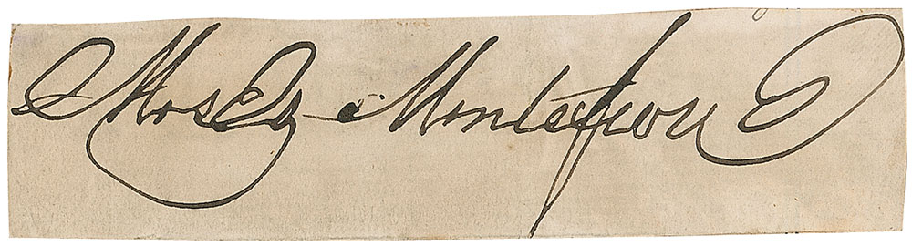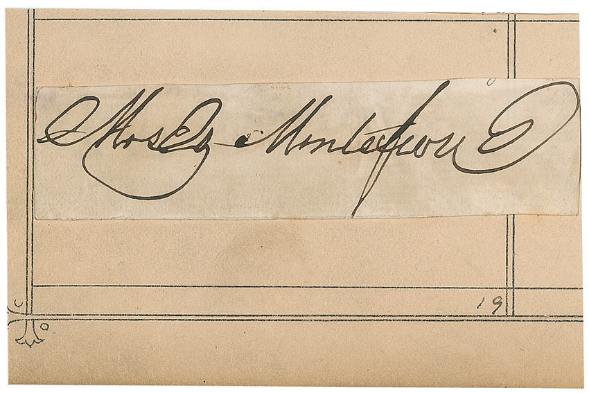 One of the most famous British Jews of the 19th century. Montefiore was a financier, banker, philanthropist, and Sheriff of London. Ink signature, “Moses Montefiore,” on an off-white 3.75 x 1 clipped slip affixed to a 4 x 2.5 off-white card. In very good condition, with scattered toning and soiling and closely trimmed edges. RRAuction COA.