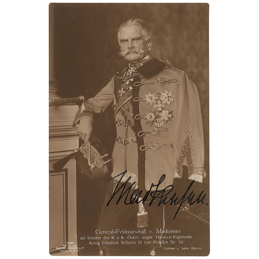 German field marshal (1849–1945) recognized as one of the German Empire's most prominent military leaders. Vintage 3.25 x 5.25 postcard photo of von Mackensen in full military dress, signed in fountain pen, “Mackensen.” In fine condition. RRAuction COA.