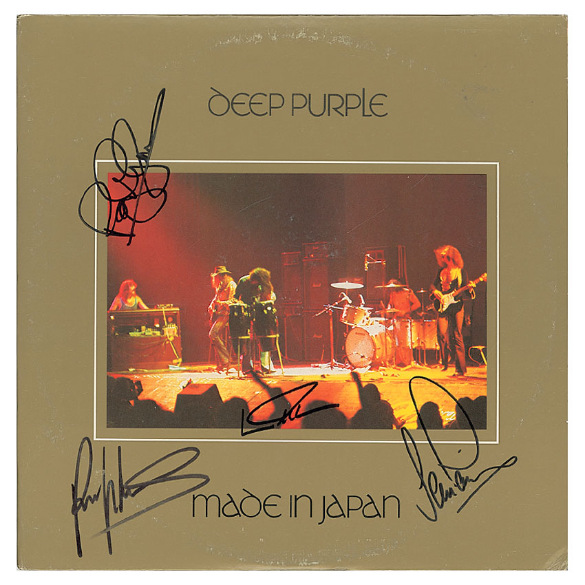 Made in Japan album signed on the front cover in black felt tip by Ritchie Blackmore, Ian Gillan, Ian Paice, and Roger Glover. A few corner creases and a moderate ‘ring of wear’ to covers, otherwise fine condition. The record is included. RRAuction COA.