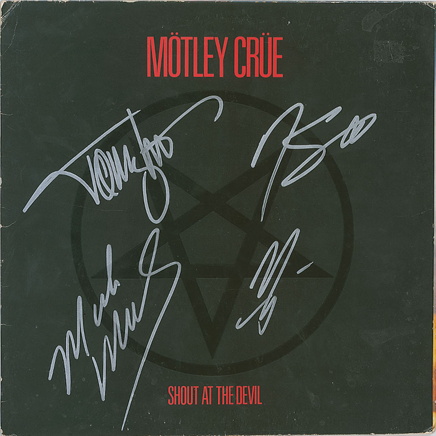 Shout at the Devil album signed on the front cover in silver ink by Nikki Sixx, Vince Neil, Mick Mars, and Tommy Lee. Adhesive remnant to top right corner of front cover, some light edge and corner creases, and a bit of light soiling, otherwise fine condition. The record is included. Pre-certified Roger Epperson/REAL and RR Auction COA.