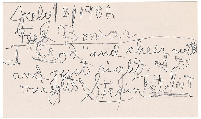 Ballpoint signature and inscription in Fetchit’s aged hand, “July 18, 1982, Fred Bomar, I ‘God’ and cheer will and just right. It’s right, Stepin Fetchit,” on a white 5 x 3 card. In fine condition. Pre-certified PSA/DNA and RR Auction COA.
