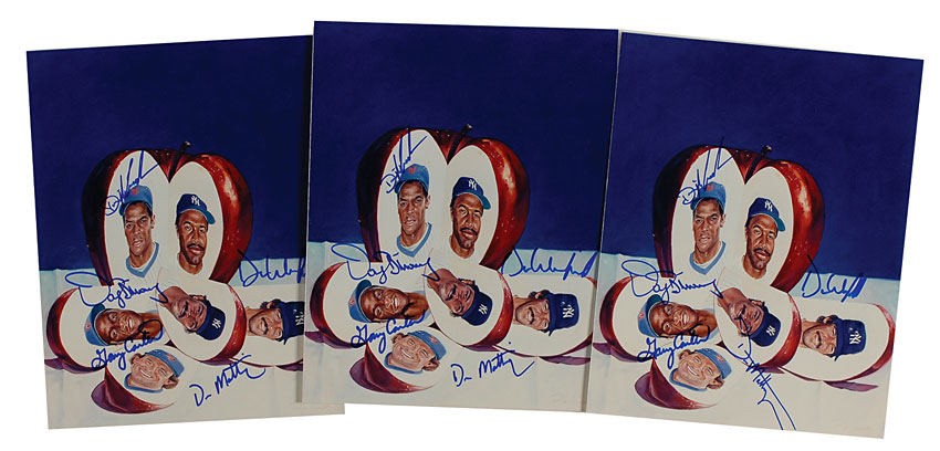 Three identical color satin-finish 8 x 10 photos of Ron Lewis’s artwork of a cut-up apple, each slice revealing a Yankee or Met player, and each signed in blue felt tip by all five players” Gary Carter, Dave Winfield, Don Mattingly, Dwight Gooden, and Darryl Strawberry. In fine condition. RRAuction COA.