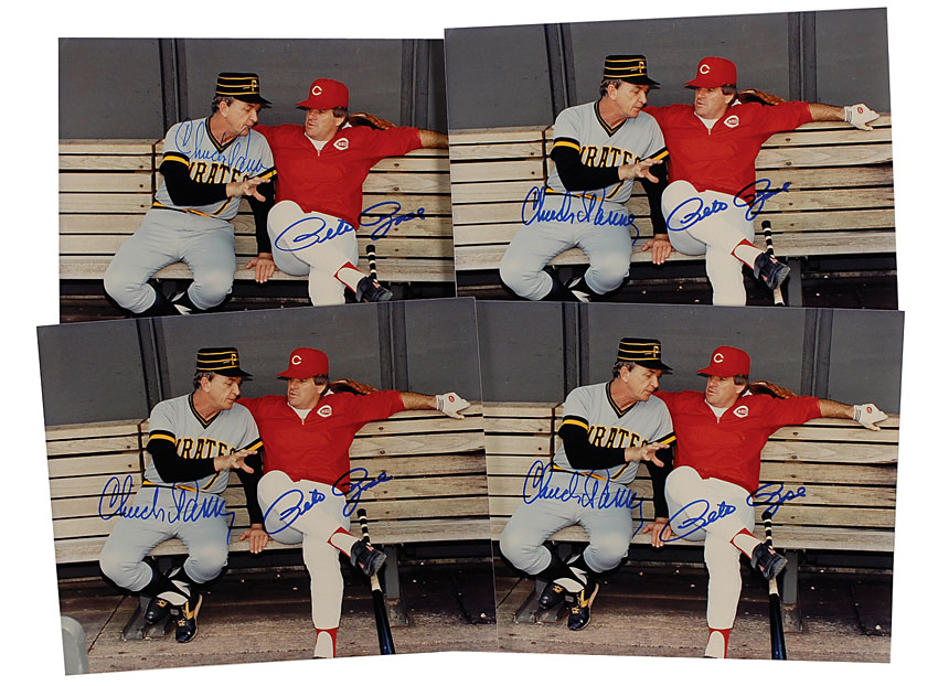 Four identical color glossy 10 x 8 photos of Tanner and Rose having a conversation together in the dugout, each signed in blue felt tip by Pete Rose and Chuck Tanner. In fine condition. RRAuction COA.