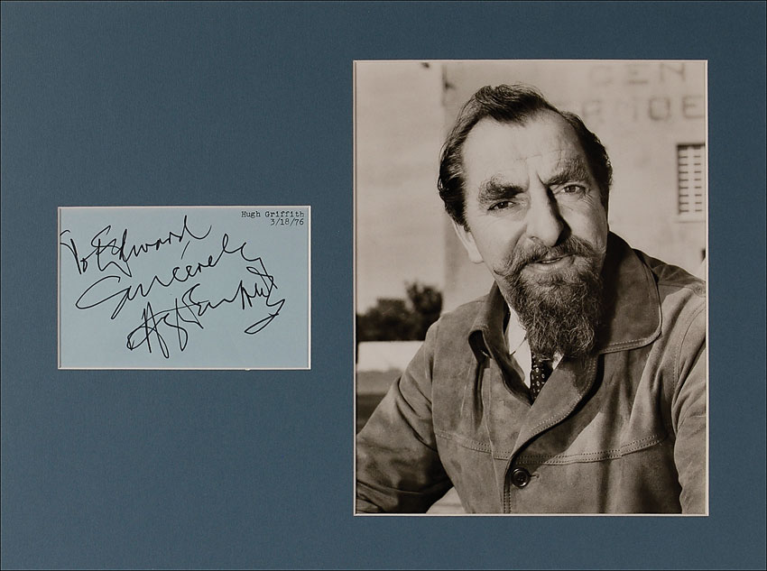 Welsh actor (1912–1980) who won an Academy Award for his supporting role in the 1959 epic Ben-Hur. Scarce felt tip signature and inscription, “To Edward, Sincerely, Hugh Griffith,” on a light blue 5 x 3.5 card, with a typed collector’s notation to top edge. Matted with a glossy portrait of Griffith, to an overall size of 16 x 12. In fine condition. Pre-certified PSA/DNA and RR Auction COA.