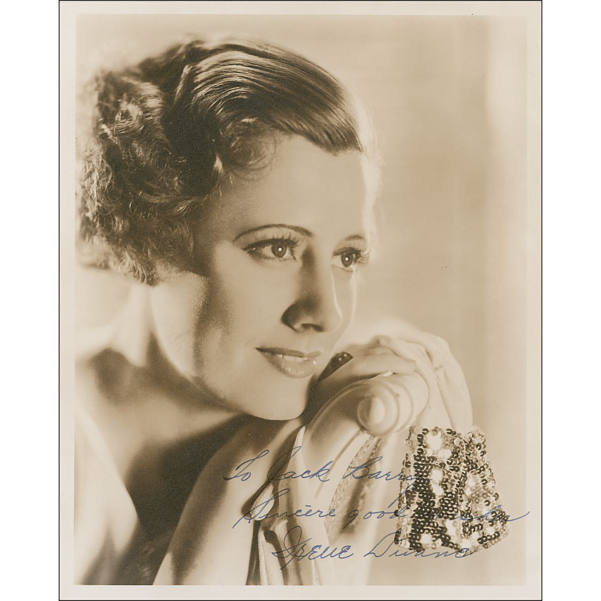 Vintage sepia matte-finish 8 x 10 head-and-shoulders photo, signed and inscribed in fountain pen “To Jack Barry, Sincere good wishes from Irene Dunne.” In fine condition, with a bit of light contrast to portion of inscription, and a bit of trivial silvering. Pre-certified PSA/DNA and RR Auction COA.