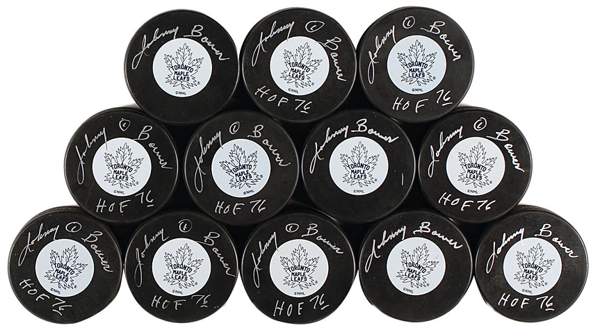 Twelve official NHL Toronto Maple Leafs hockey pucks, each signed on the logo side in silver ink by Bower, adding his Hall of Fame induction year to some of the pucks. In fine condition. RRAuction COA.