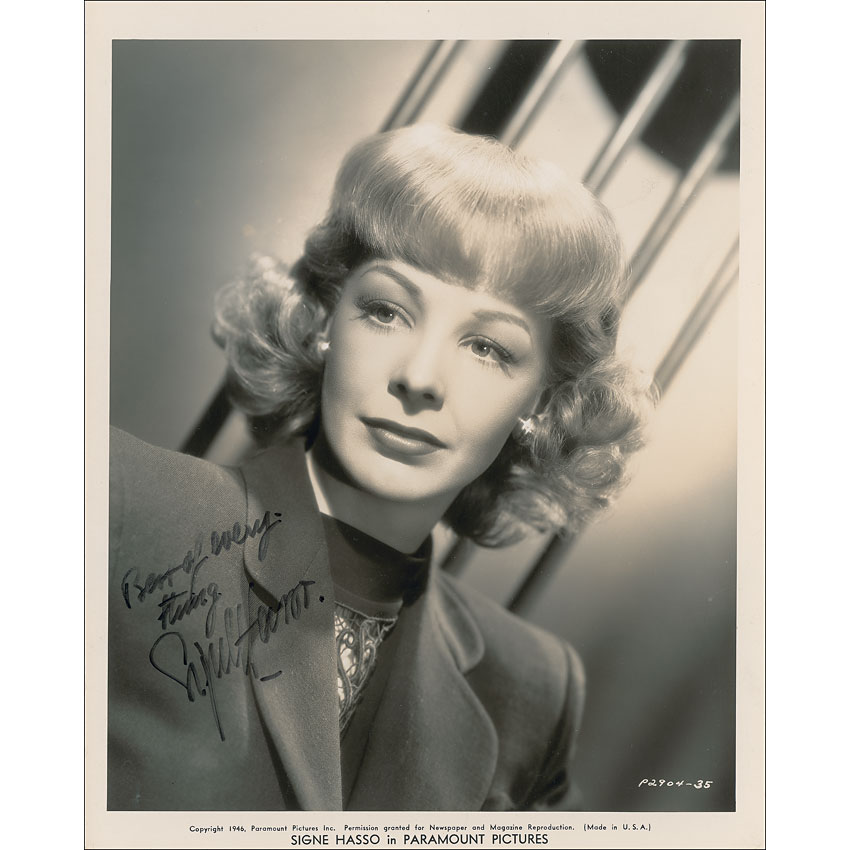 Glossy 8 x 10 doubleweight Paramount Pictures publicity photo, signed in black felt tip, “Best of everything, Signe Hasso.” In fine condition, with a few light surface marks and some mild spotting to finish. RRAuction COA.