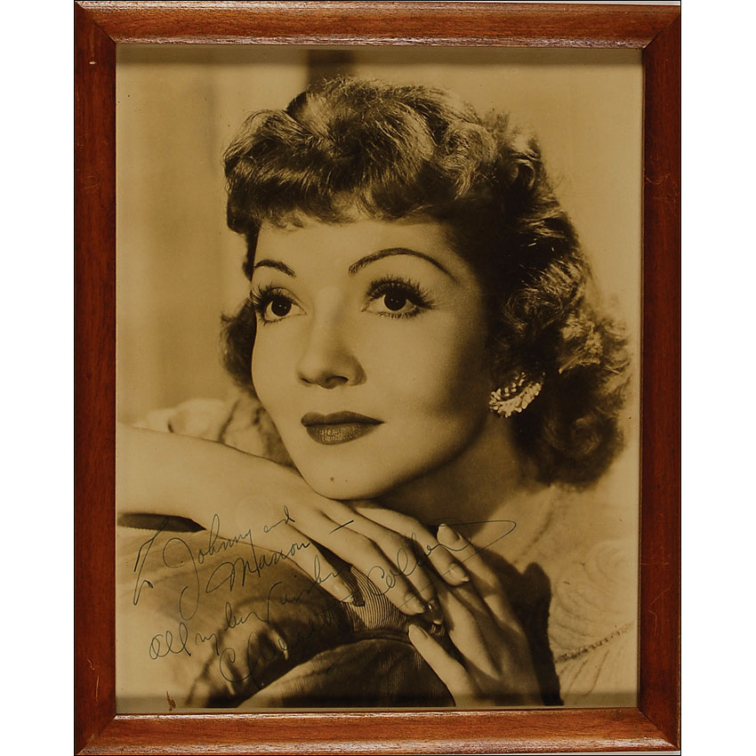 Darling vintage matte-finish 7.5 x 9.5 head-and-shoulders photo, signed and inscribed in fountain pen, “To Johnny and Marion—All my best wishes, Claudette Colbert.” Framed to an overall size of 9 x 10.75. In fine condition, with moderate contrast to the signature against the background. Pre-certified PSA/DNA and RR Auction COA.