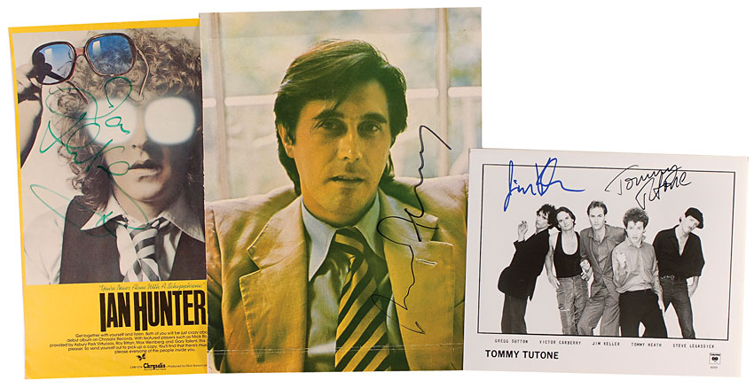 Three signed photos: two color magazine photos, 10 x 12 and 9.5 x 12.75, one a Chrysalis promotional poster for You’re Never Alone with a Schizophrenic, signed in green felt tip by Ian Hunter, and the other a head-and-shoulders shot of Brian Ferry in a suit and tie, signed vertically in black felt tip; and a glossy 10 x 8 Columbia Records promotional photo of the Tommy Tutone, signed in black felt tip by Tommy Heath and in blue felt tip by guitarist Jim Keller. In very good condition, with scattered light creases and some small edge tears to Hunter’s poster, and a trivial crease and two horizontal folds, one at the top and bottom edges, of Ferry’s poster. RRAuction COA.