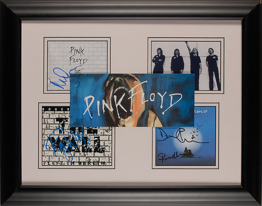 Three items: The Wall CD booklet, signed in blue felt tip by Nick Mason; The Wall Live in Berlin CD booklet, signed in blue ink by Roger Waters; and an On an Island CD booklet signed in black felt tip by David Gilmour and Rick Wright. All three items are matted and framed together with two unsigned images to an overall size of 20 x 16. In fine condition, with a small area of paper loss to Wall booklet. Pre-certified Roger Epperson/REAL and RR Auction COA.