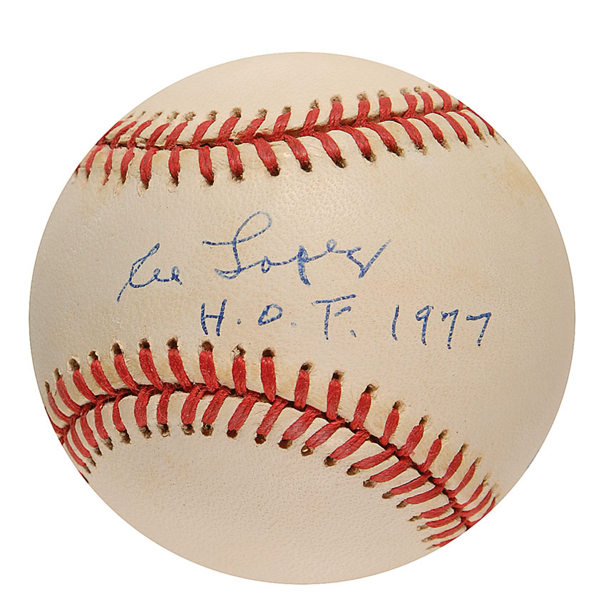 Official Rawlings American League baseball signed in blue ballpoint on the sweet spot, “Al Lopez H.O.F. 1977.” In fine condition, with some scattered light toning. Pre-certified Steve Grad/PSA/DNA and RR Auction COA.