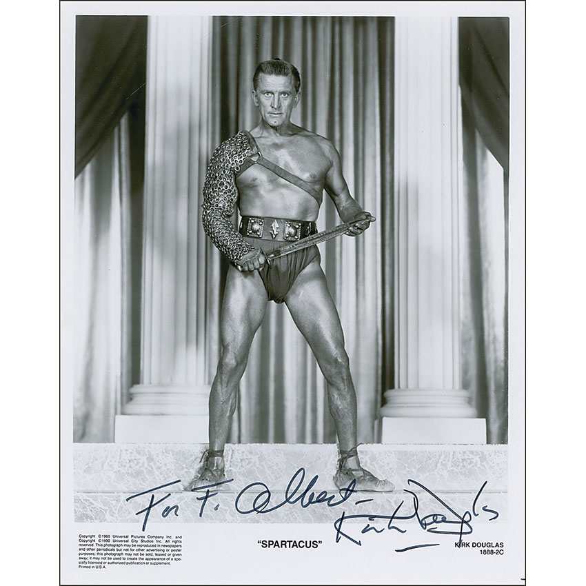 Intimidating glossy 8 x 10 Universal promotional photo for Spartacus, signed and inscribed in black felt tip “For F. Albert, Kirk Douglas.” In fine condition. Pre-certified PSA/DNA and RR Auction COA.