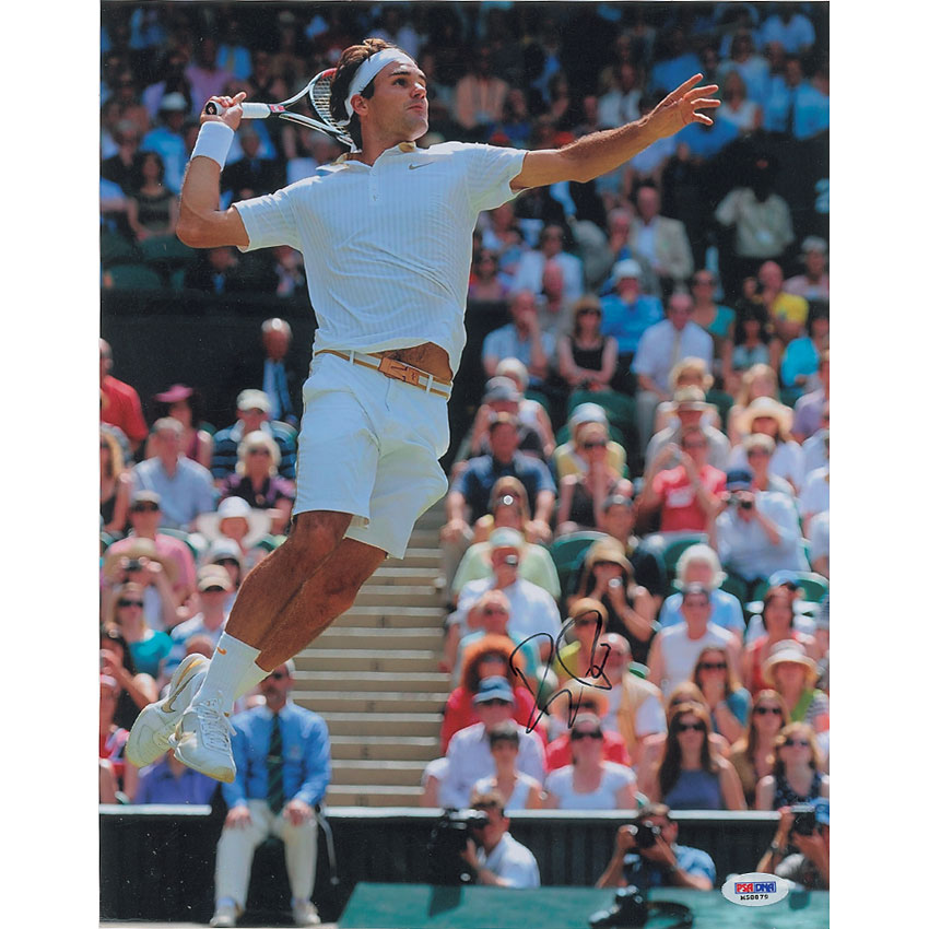Color satin-finish 11 x 14 photo of Federer in the midst of a serve, signed in black felt tip. In fine condition, with a PSA/DNA authentication label affixed to lower corner. Accompanied by a certificate of authenticity from PSA/DNA. RRAuction COA.