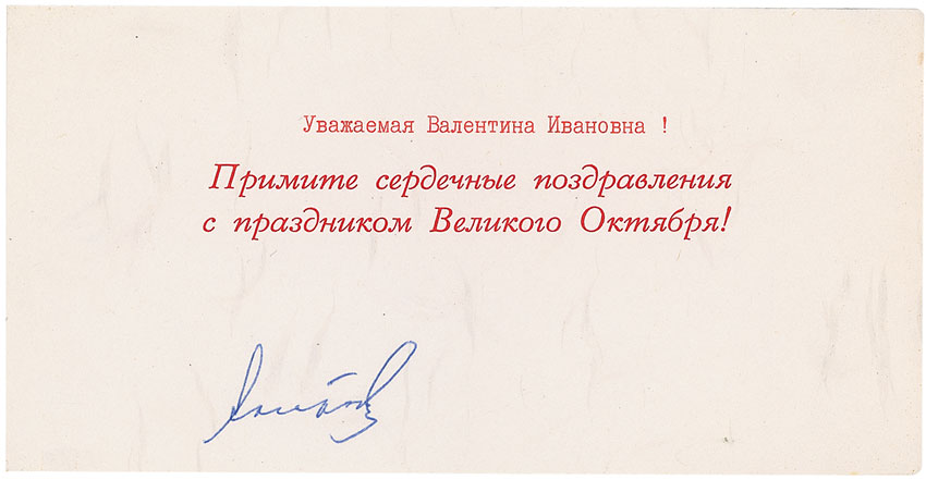 Appointed KGB chief in 1967, he became a full member of the Politburo in 1973. His firm handling of dissident movements enhanced his reputation, enabling him to be chosen as Brezhnev's successor in 1983, but he died after less than 15 months in office. Printed greeting card, with a message in Russian, 7.5 x 4, signed at the bottom in blue ink. In fine condition. RRAuction COA.