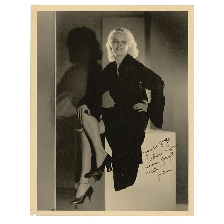 Legendary screen actress (1911–1937), known for her unique sex appeal and her distinctive platinum blonde hairdo, who died of renal failure at the age of 26. Fantastic and incredibly rare vintage oversized matte-finish 10 x 13 Clarence Sinclair Bull full-length portrait of Harlow in a black dress sitting atop a white cube, her platinum blonde hair beautifully lit, signed in fountain pen for her close friends, bandleader (the Kentucky Serenaders) Johnny Hamp and his wife Ruth, “Youse guys I adore you, never forget that—Jean.” The lower right corner bears Bull’s blindstamp, and the reverse is rubberstamped “Camera Study by Clarence Sinclair Bull. Kindly credit.” In fine condition, with almost all flaws confined to the borders (four tack holes to border, light creasing to corner tips, and a trivial chip to bottom edge), along with some scattered light silvering and a couple barely noticeable areas of discoloration to the image area.