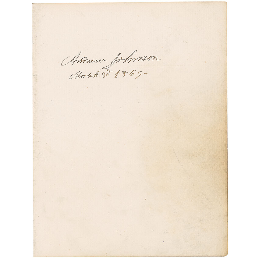 Ink signature, on his last full day as president, “Andrew Johnson, March 3d, 1869,” on an off-white 6.75 x 9 album page. In fine condition, with some scattered light toning and edge wear, almost all of which could be matted out. Undoubtedly one of Johnson’s last signatures while serving as Chief Executive. Pre-certified John Reznikoff/PSA/DNA and RR Auction COA.