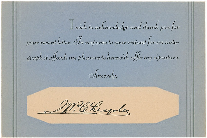 Automotive mogul (1875–1940) who founded the Chrysler Corporation. Fountain pen signature, “W. P. Chrysler,” on a light blue 6 x 4 pre-printed autograph response card. In fine condition, with a bit of light edge toning. RRAuction COA.