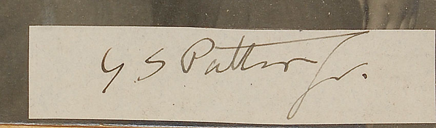 Ink signature, “G. S. Patton, Jr.,” on an off-white 3 x .75 clipped slip. Slip is affixed to the lower right corner of a vintage unsigned 9.25 x 7.25 press photo of Patton with his grandchildren. Signature, photo, and caption are framed to an overall size of 12 x 13.5. A closely trimmed top edge, some light silvering to accompanying photo, and fading to caption, otherwise fine condition. Also accompanied by a December 25, 1945, TLS bearing a printed Patton signature, sending Christmas wishes to members of the Fifteenth Army. Pre-certified PSA/DNA and RR Auction COA.