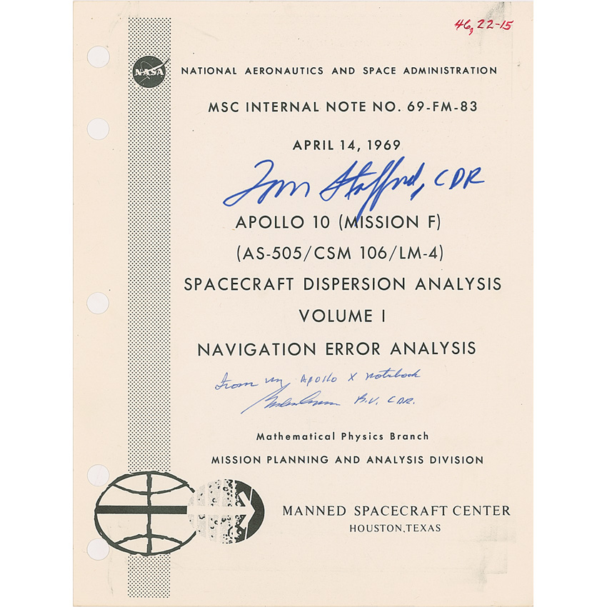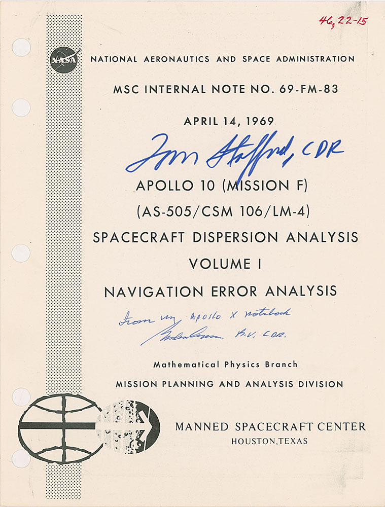Gordon Cooper’s personal Apollo 10 Spacecraft Dispersion Analysis Manual, 8 x 10.5, 35 unbound pages, signed on the front cover in blue ballpoint, “From my Apollo X notebook, Gordon Cooper B.U. CDR.,” and in blue felt tip, “Tom Stafford, CDR.” In fine condition, with small ink notation to top right of cover as well as a bit of light soiling. Pre-certified Steve Zarelli.