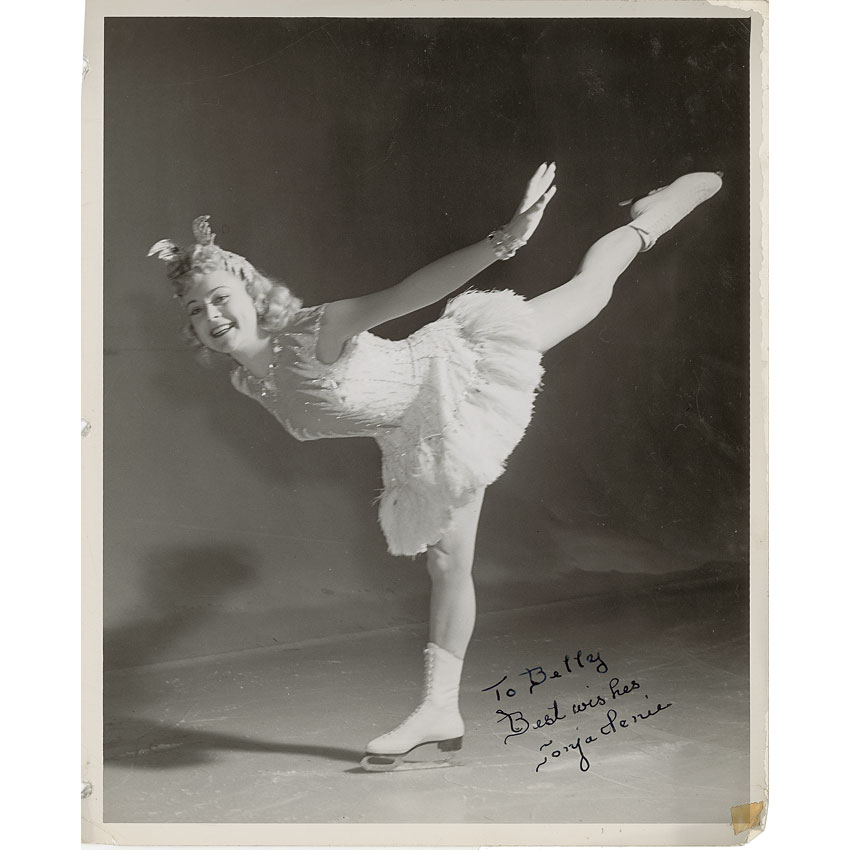 Adorable vintage glossy 8 x 10 photo of Henie in a feathery costume on the ice, signed and inscribed in fountain pen, “To Betty, Best wishes, Sonja Henie.” In very good condition, with scattered creasing, some light emulsion to the finish, an adhesive remnant to the bottom right corner, and three partial binder holes to the left edge. Pre-certified PSA/DNA and RR Auction COA.