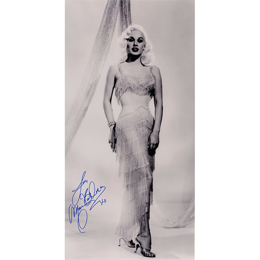 Satin-finish 12 x 24 photo of Van Doren in an evening gown, signed in blue felt tip, “Love, Mamie Van Doren xx.” In fine condition. Pre-certified PSA/DNA and RR Auction COA.