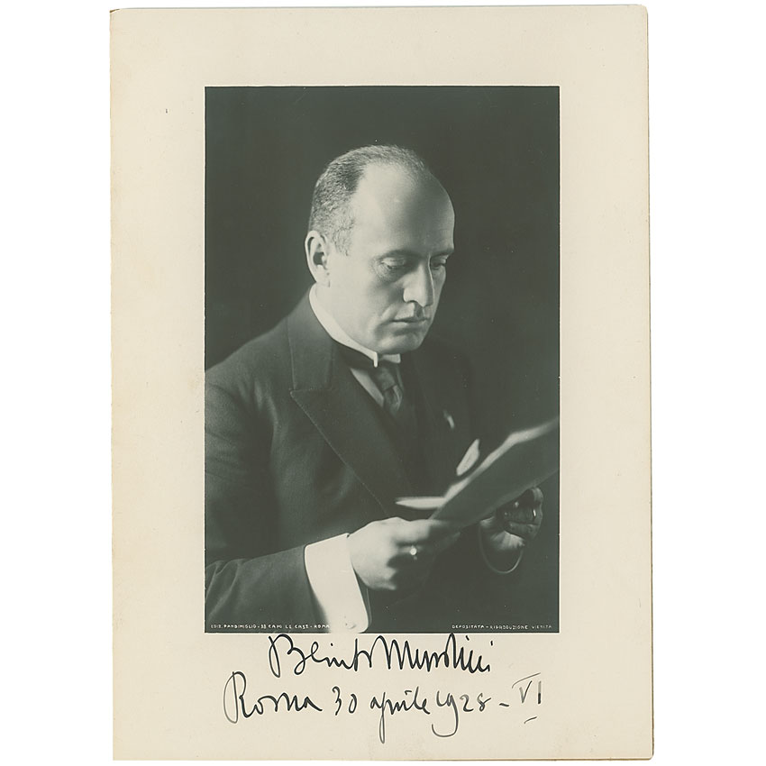 Vintage matte-finish 8 x 11.25 photo of Mussolini reading from a page, neatly signed in the lower border in fountain pen “Benito Mussolini, Roma 30 aprile 1928–VI.” Photo is afixed to an identical size board. In fine condition. Accompanied by a full letter of authenticity from James Spence Authentication. A terrific pose, made all the better by Mussolini signing with his far less common full name. Pre-certified PSA/DNA and RR Auction COA.