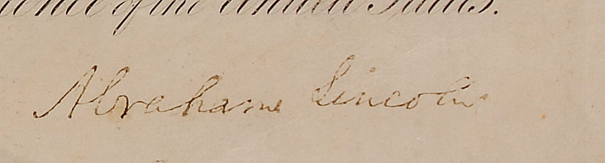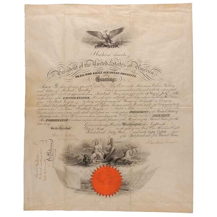 War-dated partly-printed vellum DS as president, one page, 15.75 x 19.25, May 18, 1864. President Lincoln appoints Michael Bradley an “Assistant Surgeon on the Navy.” Signed at the conclusion by Lincoln, and countersigned by Secretary of the Navy Gideon Welles. Intersecting folds, scattered creases and wrinkles, scattered light toning and soiling, Welles’s signature light, but mostly legible, and some light skipping to Lincoln’s signature, and several small holes above top vignette, otherwise very good condition. The orange naval seal at the bottom is soiled and worn, but intact. Both surgical and naval presidential appointments are highly collectible; this one, combining both areas and made even more desirable by the particular president who signed it, is a perfect storm! Pre-certified John Reznikoff/PSA/DNA and RR Auction COA.