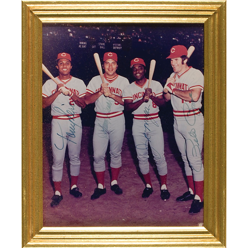 Color glossy 8 x 10 photo of members of the ‘Big Red Machine,’ signed in blue felt tip by Tony Perez, Johnny Bench, Joe Morgan, and Pete Rose. Framed to an overall size of 9.5 x 11.5. In fine condition, with some fading to Bench and Rose signatures. Pre-certified Steve Grad/PSA/DNA and RR Auction COA.