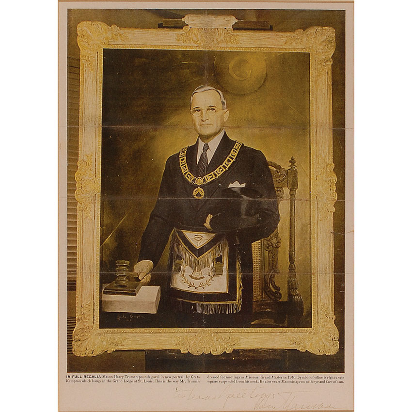 Color 9.5 x 13.5 magazine photo of Truman in his Masonic regalia, signed in the lower border in black ink, “Fraternal greetings, Harry S. Truman.” Matted and framed to an overall size of 15 x 19. In very good condition, with intersecting folds, some minor skipping to Truman’s light, but legible signature, some light toning, and a couple small edge tears. Pre-certified John Reznikoff/PSA/DNA and RR Auction COA.