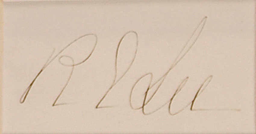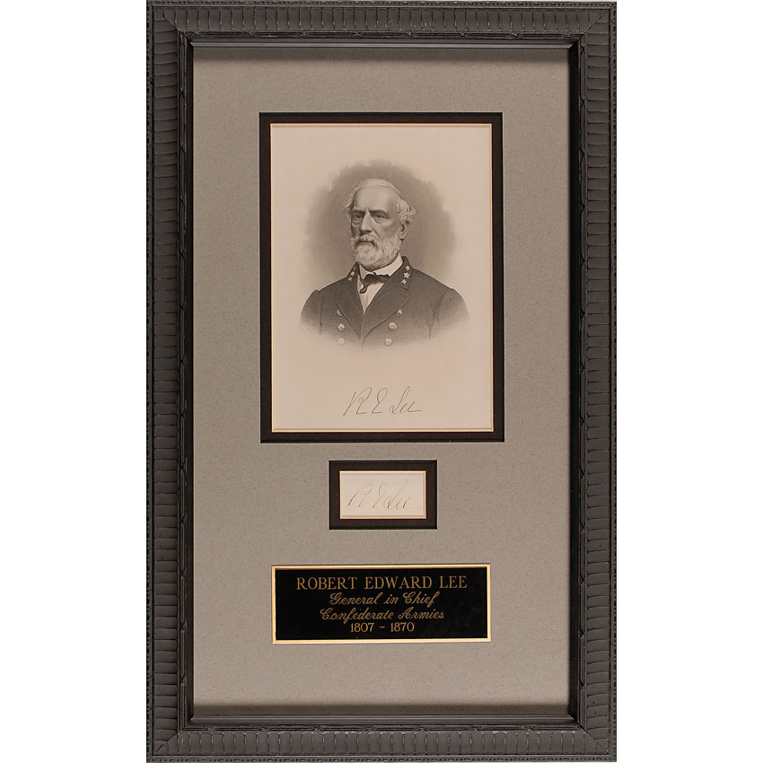 Superb crisp ink signature, “R E Lee,” on an off-white slip. Double matted and framed with an engraved portrait of Lee, bearing a printed signature and a small plaque, to an overall size of 11 x 17.5. In fine condition. Pre-certified John Reznikoff/PSA/DNA and RR Auction COA.