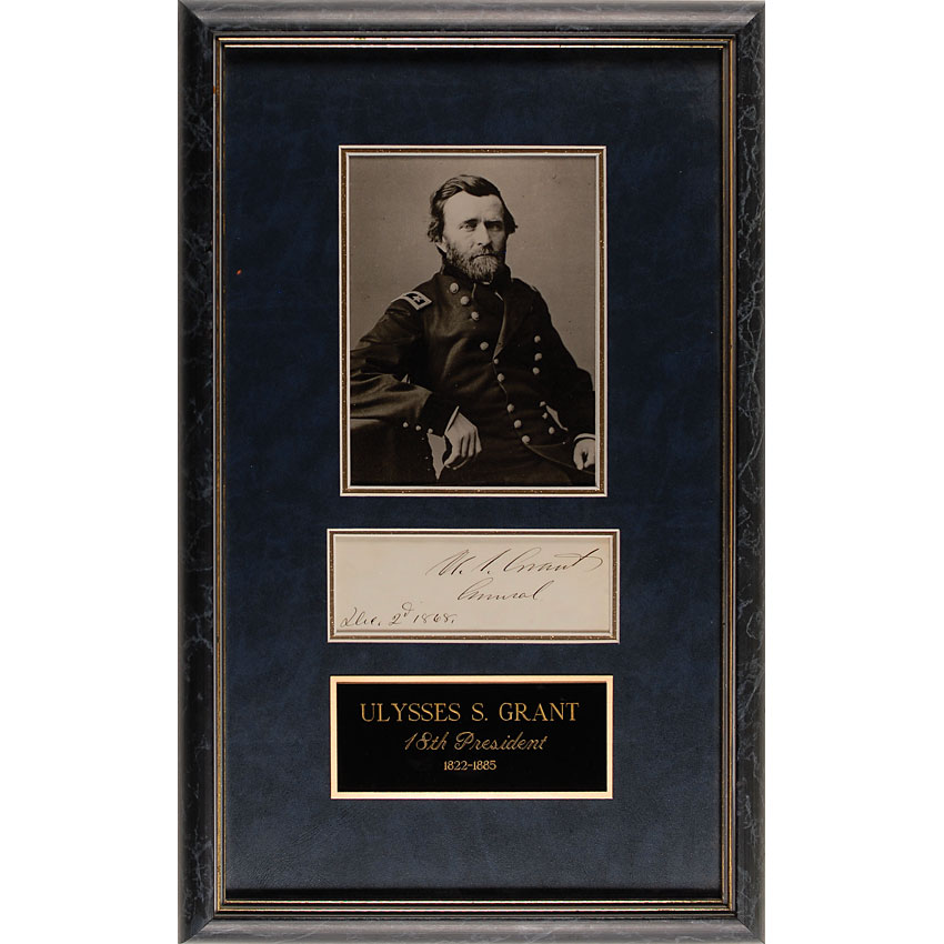 Ink signature, as president-elect, “U. S. Grant, General, Dec. 2d, 1868,” on an off-white slip. Double matted and framed, with a portrait of Grant and a small name plaque, to an overall size of 11 x 18. In fine condition. Pre-certified John Reznikoff/PSA/DNA and RR Auction COA.
