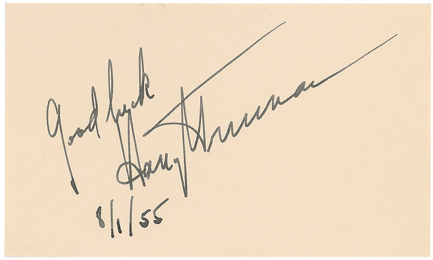 Vintage ink signature, “Good luck, Harry S. Truman 8/1/55,” on an off-white 5 x 3 card. In fine condition. Pre-certified John Reznikoff/PSA/DNA and RR Auction COA.